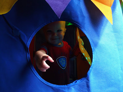 My mom & dad got Luke this cute circus tent for his 1st birthday and I'm just now getting around to putting up the pictures of him playing in it. He really enjoys going in and coming out, but today I found him playing in there with some of his toys. So these are for my mom's benefit mostly, but you may enjoy them too :)